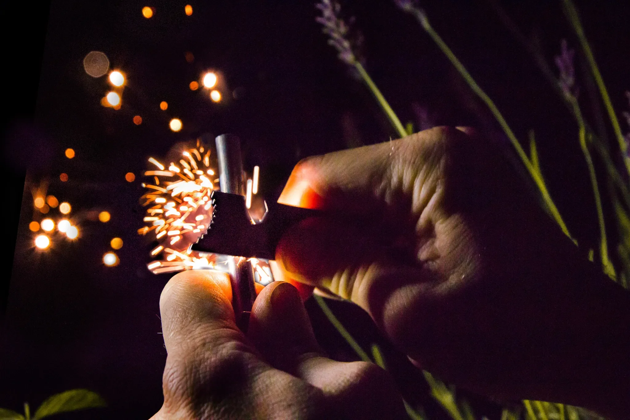 - Mit der scharfen Kante des Schabers kräftig entlang des Feuerstahls schaben, bis Funken auf den Zunder fallen.