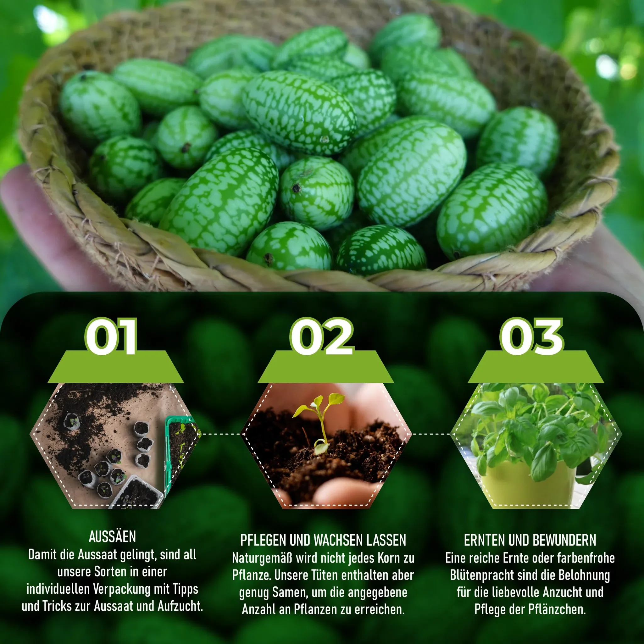 Die Mexikanische Minigurke (Melothria scabra) ist ein schnell wachsendes, einjähriges Kürbisgewächs mit bis zu 3 m langen, rankenden Trieben. Im Sommer bildet sie zahlreiche, etwa 2 cm große Früchte, die aussehen wie winzige Wassermelonen – knackig, frisch und leicht säuerlich im Geschmack. Ideal zum Snacken, für Salate oder zum Einlegen!